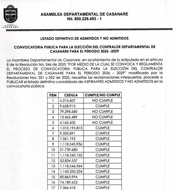 La Asamblea Departamental de Casanare expidió este viernes 19 de septiembre el listado definitivo de admitidos y no admitidos en la convocatoria para elegir al nuevo contralor departamental. De los 123 aspirantes, 25 fueron excluidos y 98 continúan en competencia.