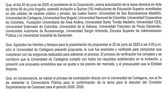 Cinco días después, el 25 de junio a las 5:00 p. m., se cerró el plazo. Solo la Universidad de Cartagena presentó propuesta, lo que sirvió de argumento para contratarla en forma directa, sin competencia y sin que existiera un procedimiento abierto y público que garantizara pluralidad de oferentes.