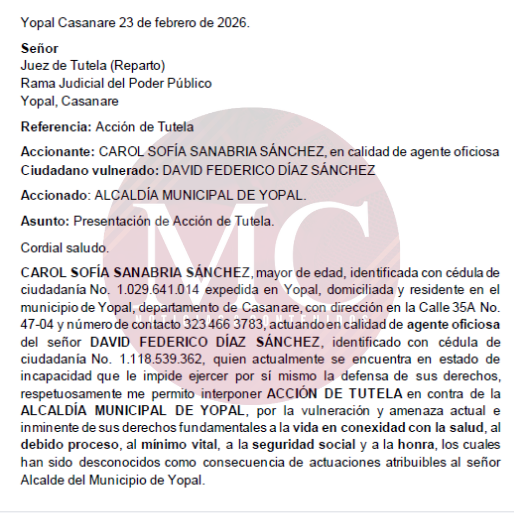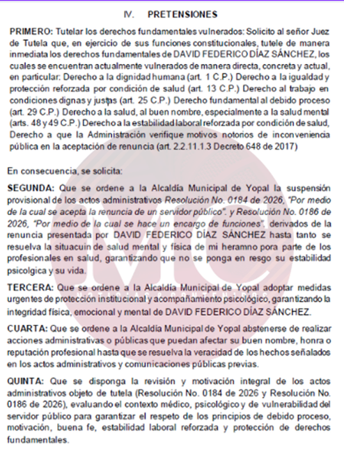 Un caso poco común se tramita en los juzgados de Yopal: el exsecretario de Educación, David Federico Díaz Sánchez, busca que se suspenda el acto administrativo mediante el cual la Alcaldía de Yopal aceptó su renuncia y designó a un reemplazo, pese a que él mismo había presentado dimisión “voluntaria e irrevocable”.