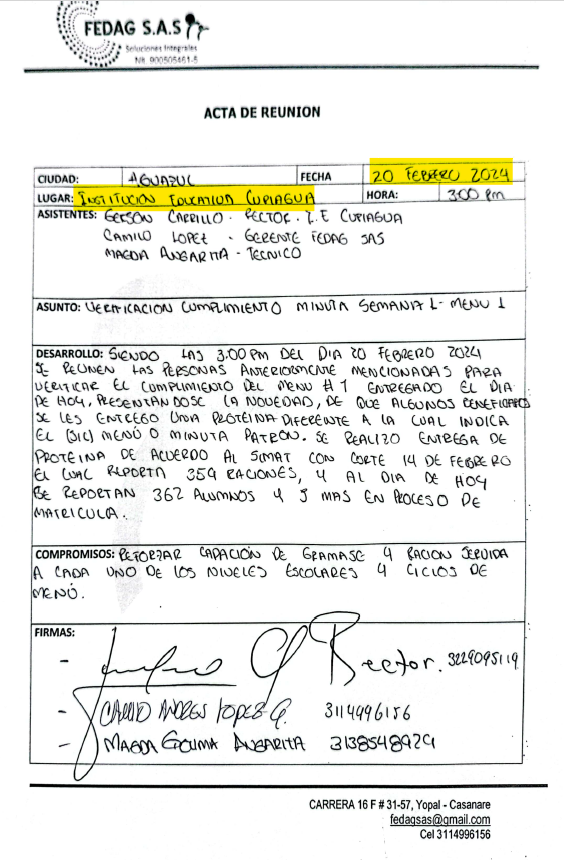 - Sobre la denuncia de supuesta entrega irregular de los alimentos a los beneficiarios del programa en la institución educativa Cupiagua en Aguazul reportada en redes sociales y en donde se conocieron unas fotos que mostraban que el almuerzo servido era arroz, papa y huevo, se aclaró que ese día el menú contemplaba arroz, ensalada de repollo, zanahoria y cebolla con mayonesa, papa salada, pollo en salsa, jugo de guayaba, colada de avena y una bolsa de agua.