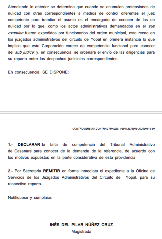 En una de ellas, la magistrada Inés del Pilar Núñez Cruz declaró que el Tribunal no tiene competencia para conocer la demanda presentada por el Municipio de Yopal contra Catasig.