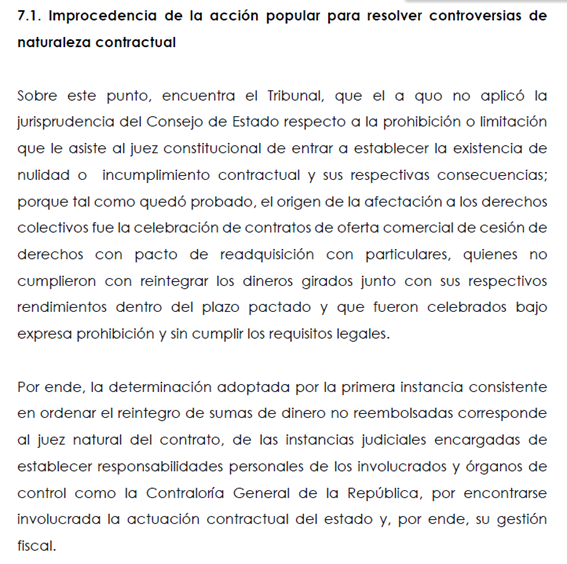 - Confirmó el daño al patrimonio público, pero aclaró que la acción popular no es para ordenar que la Gobernación reciba plata “ya”, sino para proteger derechos colectivos. La recuperación debe ir por procesos contractuales, fiscales o ejecutivos (el “juez natural” del contrato).